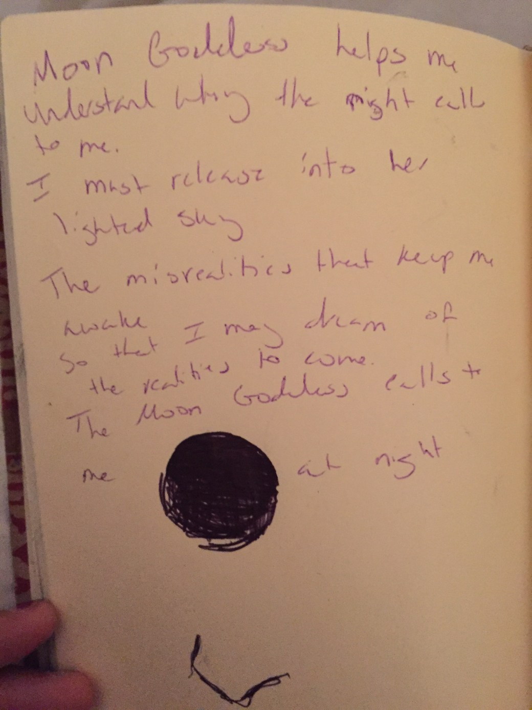 Moon Goddess calls to me at night Helping me understand the Misrealities that I most release Into the lighted sky Moon Goddess calls to me Freeing me to dream of Realities to come…